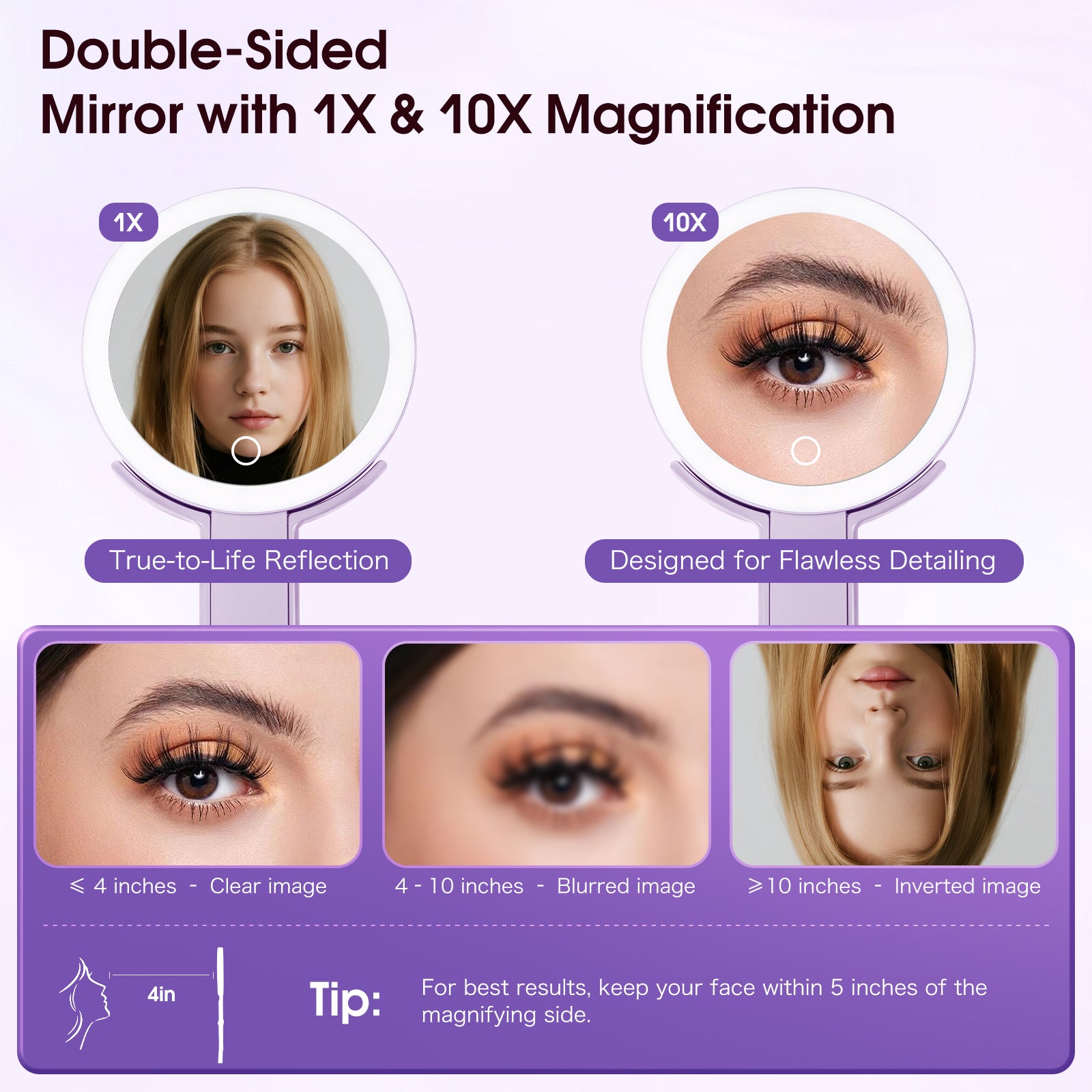 Dual-Sided Mirror (1X & 10X): 1X side is ideal for full-face makeup and skincare, while 10X magnification helps with fine details like eyeliner, mascara, and blemish checks.